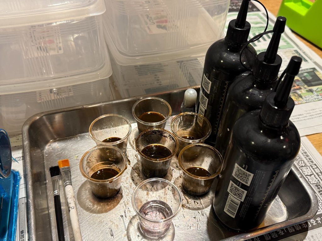 レジン10gに茶色の絵の具0.2gを加え、色が均一になるまでよく混ぜる。