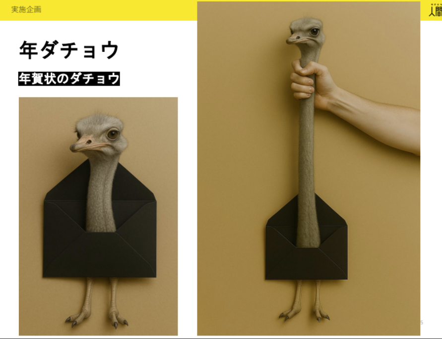 万博イヤーにかけた「ミャクあり年賀状」や、性格の悪そうな「催促状」。実現不可能な「年ダチョウ」など、個性的なアイデアがたくさん集まりました。